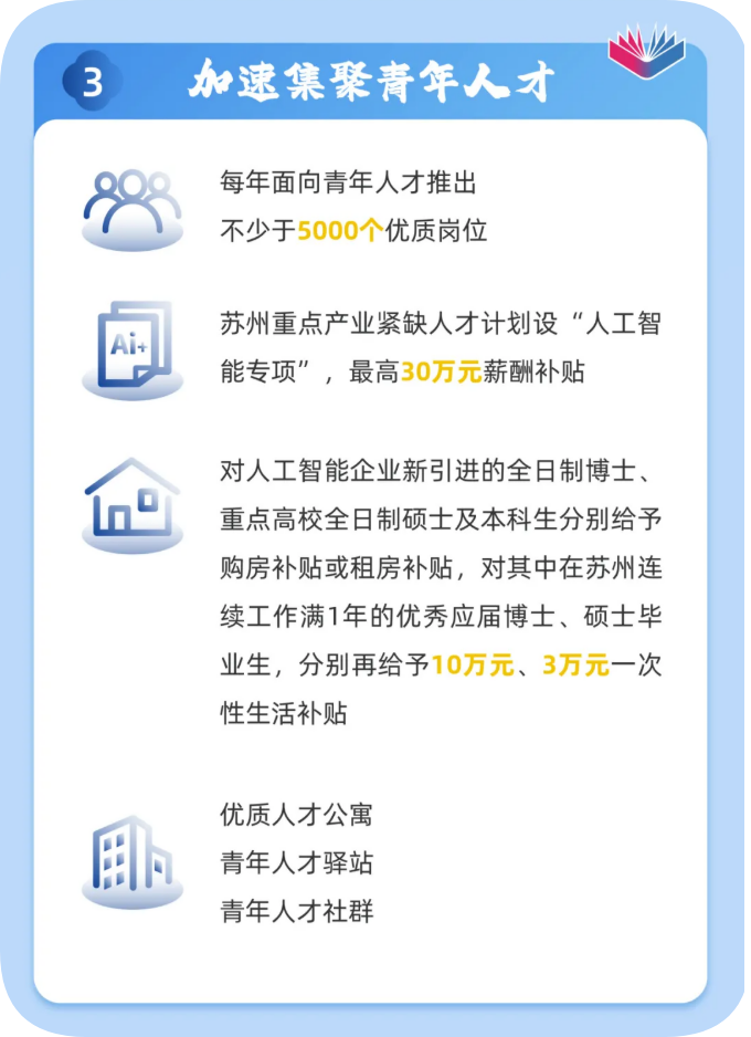 人工智能領域國際性知名賽事或國內重點賽事前10名獲獎選手來蘇州創(chuàng)新創(chuàng)業(yè)的,可直接認定為人才分類認定目錄的緊缺型人才,享受最高30萬元購房補貼或不低于1500元/月的租房補貼。