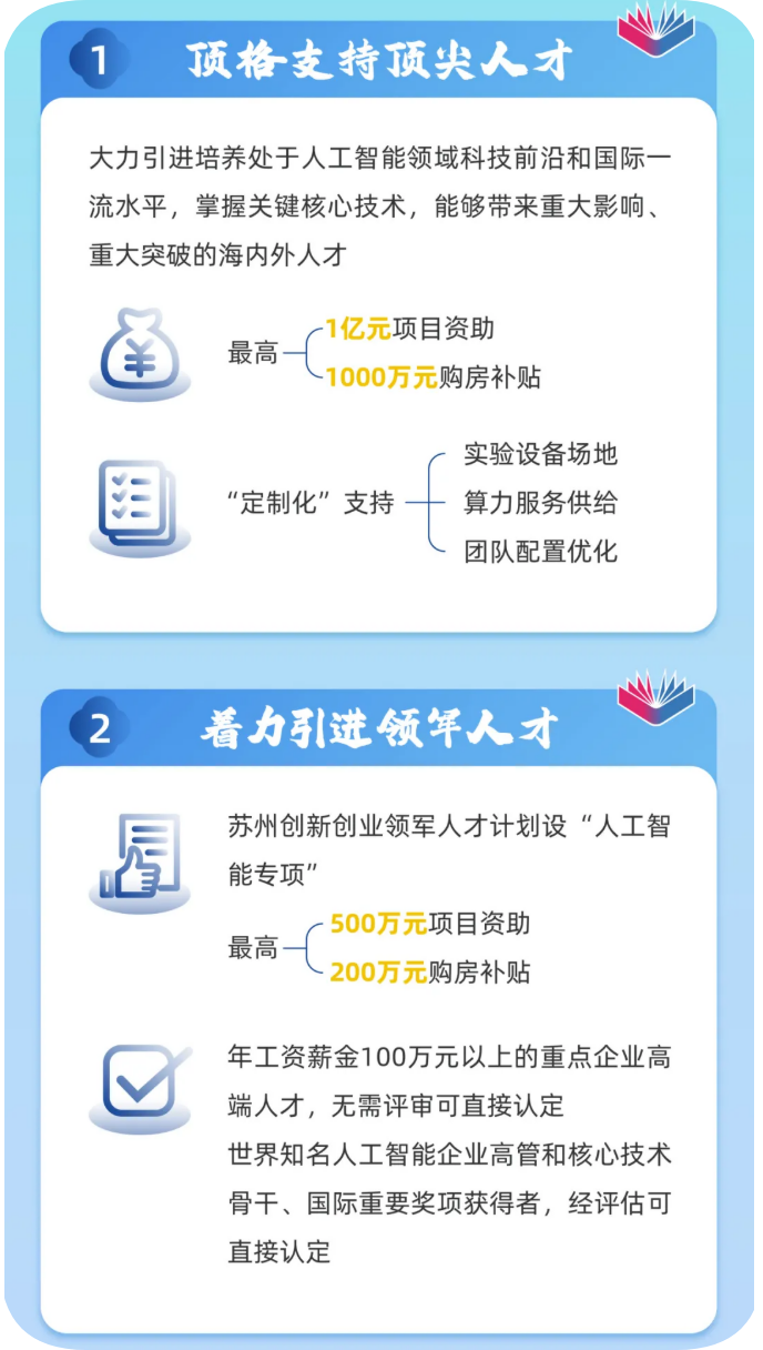 在蘇州創(chuàng)新創(chuàng)業(yè)領軍人才計劃中,每年專設100個左右“人工智能專項”名額,特別優(yōu)秀的可突破學歷、來蘇州時間等限制,給予100萬元~500萬元項目資助和100萬元~200萬元購房補貼。世界知名人工智能企業(yè)高管和核心技術骨干、國際重要獎項獲得者,經評估可直接認定。