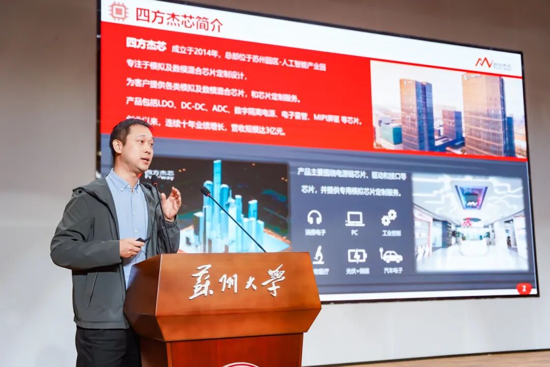 蘇州大學(xué)校友、蘇州四方杰芯電子科技有限公司市場與運(yùn)營總監(jiān)邢萬榮分享了與大學(xué)四位舍友攜手創(chuàng)業(yè)的故事,傳遞了“快樂工作、盡情生活”的蘇城生活工作理念,誠邀學(xué)弟學(xué)妹留在蘇州、暢享精彩。用人單位代表固德威技術(shù)股份有限公司、思必馳科技股份有限公司現(xiàn)場進(jìn)行推介,展現(xiàn)了蘇州企業(yè)招才引智的誠意與求賢若渴的熱忱。