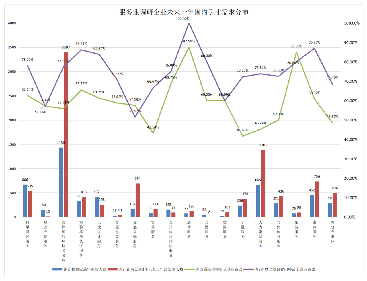 企業在招聘人才中傾向于有工作經驗的人才。82%的參調企業傾向招聘有兩年以上工作經驗的員工。從先進制造業中有兩年以上工作經驗人才需求的企業數量占比看,新能源汽車、新一代信息技術、高端裝備排名前三,占比86%以上。服務業中法律服務行業企業對有兩年以上工作經驗人才的需求占比達到了100%,其次為康養服務、檢驗檢測認證服務。同時有77.25%的企業未來一年內計劃招聘研發技術類緊缺人才崗位;21.57%的企業未來一年內計劃招聘銷售客服類緊缺人才崗位。