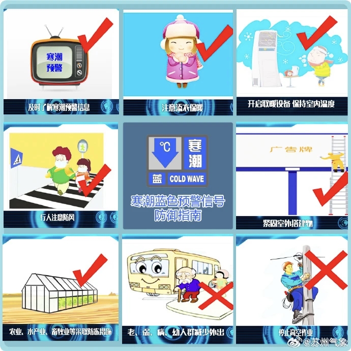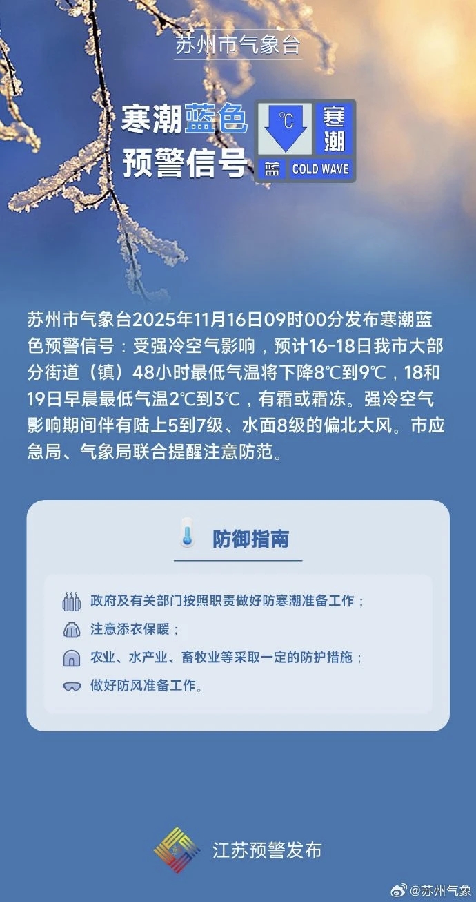 蘇州市氣象臺11月16日09時00分發(fā)布寒潮藍(lán)色預(yù)警信號。受強(qiáng)冷空氣影響,預(yù)計16-18日我市大部分街道(鎮(zhèn))48小時最低氣溫將下降8℃到9℃,18和19日早晨最低氣溫2℃到3℃,有霜或霜凍。強(qiáng)冷空氣影響期間伴有陸上5到7級、水面8級的偏北大風(fēng),市應(yīng)急局、氣象局聯(lián)合提醒,注意防范。