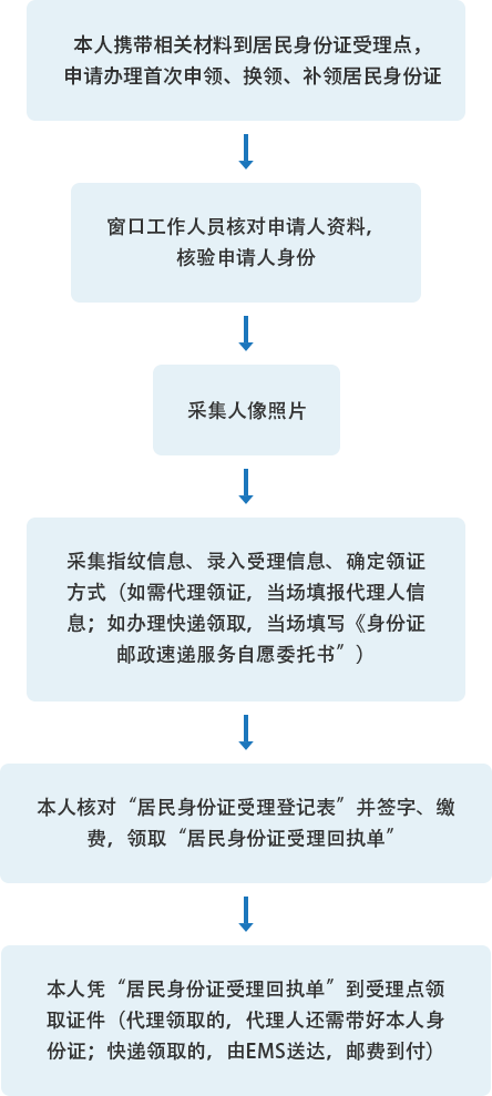 | 申報材料: | 首次申領(lǐng):申請人居民戶口簿;換領(lǐng):原居民身份證;補領(lǐng):居民戶口簿、機動車駕駛證、護照等公安機關(guān)簽發(fā)的有效身份證件。未滿16周歲公民,由監(jiān)護人陪同代為辦理,須交驗監(jiān)護人居民身份證、申請人居民戶口簿(如未登記父母子女關(guān)系,還須提交申請人出生醫(yī)學(xué)證明或其他證明監(jiān)護關(guān)系的材料)或居民身份證(僅限居民身份證換領(lǐng))。 |