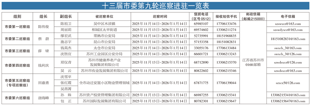 根據市委統一部署,本輪巡察組建6個市委巡察組對吳中區木瀆鎮等6個單位開展常規巡察,對蘇州國際發展集團有限公司等4個單位開展巡察“回頭看”,同時開展全市動遷安置小區物業管理領域專項巡察。近日,市委巡察組已全部進駐被巡察單位,并公布聯系方式。